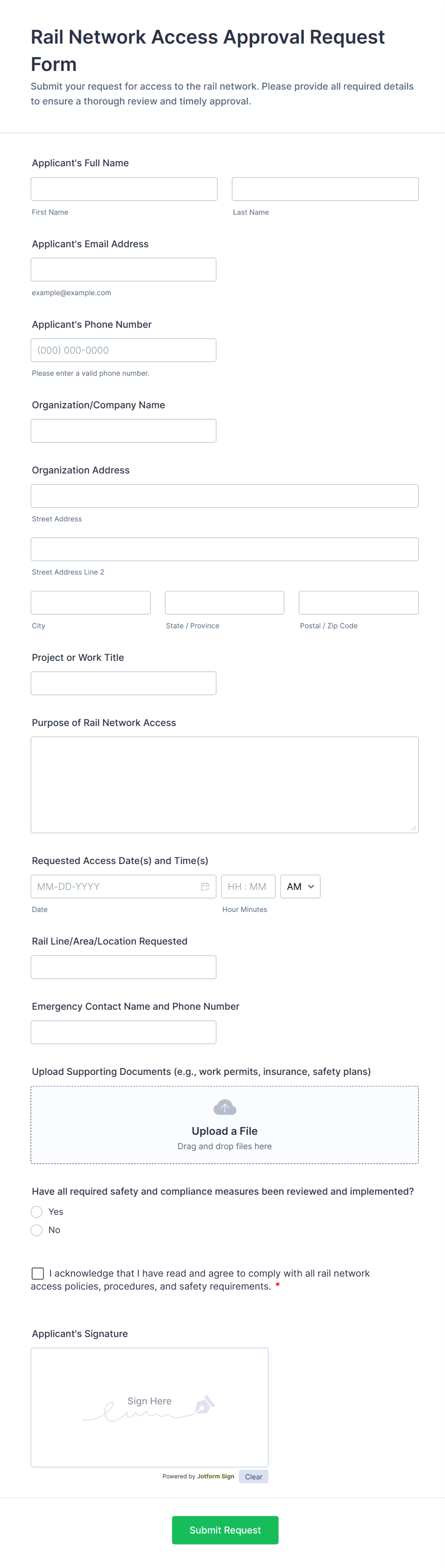 Collect and manage visitor entry requests with the Industrial Site Access Control Request Form, ideal for industrial facilities that need consistent data collection, clear approvals, and fast routing of each form submission in Jotform.