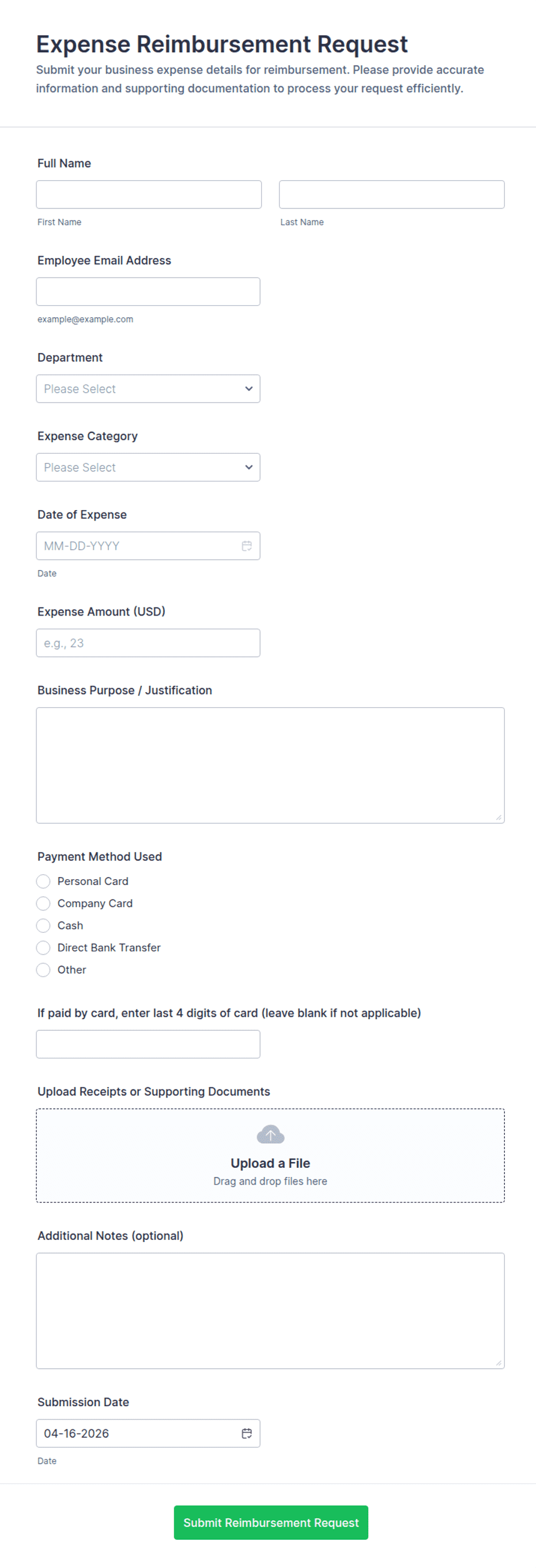 - File upload for receipts or supporting documents