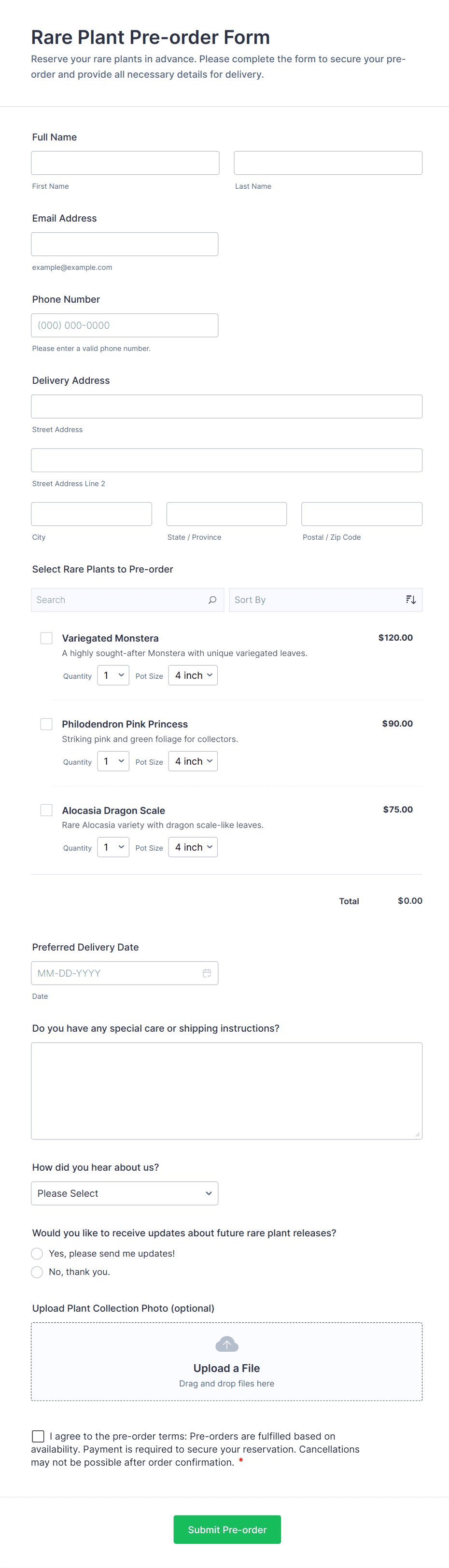 Preorder forms are specialized online forms designed to collect advance orders for products or services before they are officially released or available for general sale. Businesses, creators, and organizations use preorder forms to gauge demand, secure early sales, and streamline inventory planning for upcoming launches. These forms are commonly used for new product releases, limited-edition items, event tickets, seasonal goods, or even digital content. By allowing customers to reserve or purchase items ahead of time, preorder forms help businesses manage expectations, reduce the risk of overproduction, and build excitement around new offerings.