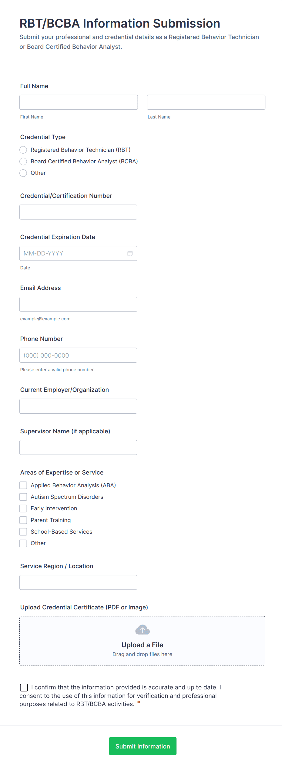 • For verification, include fields for uploading documents (e.g., ID, proof of address, certificates).