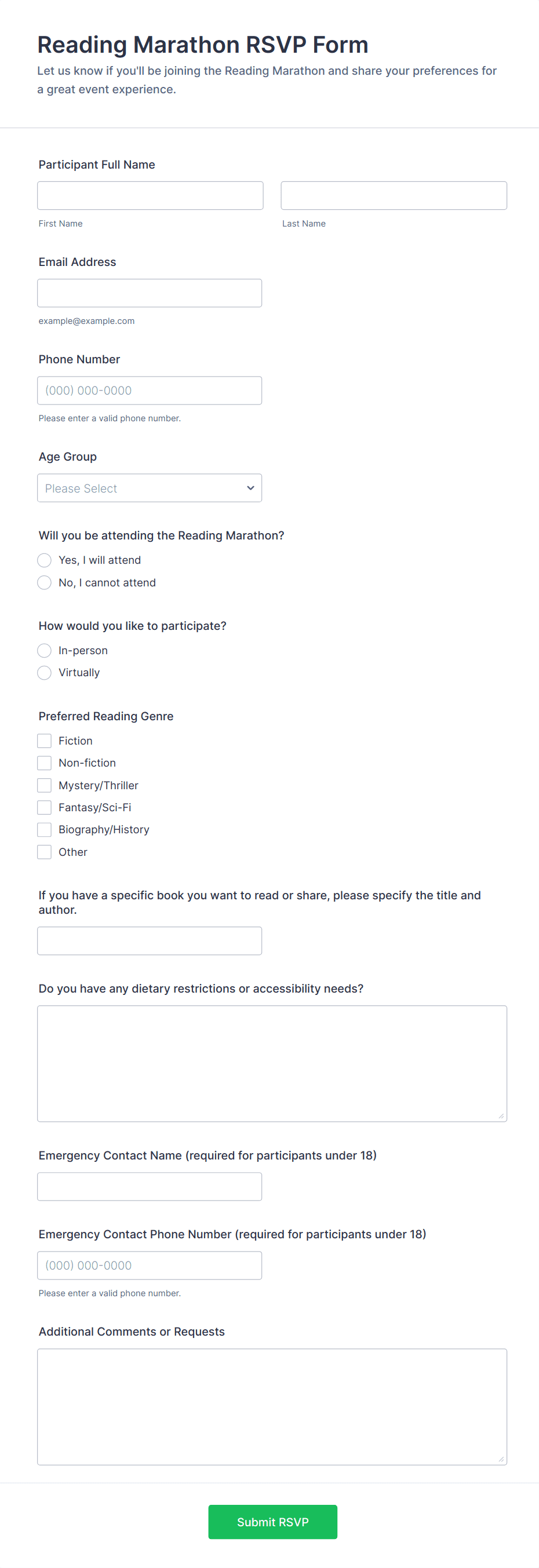 RSVP forms are digital tools designed to collect responses from invitees regarding their attendance at events, gatherings, meetings, or special occasions. Whether you’re organizing a wedding, corporate seminar, birthday party, or community event, RSVP forms streamline the process of confirming guest participation, gathering essential details like meal preferences, plus-ones, or special requirements. These forms help event organizers efficiently manage headcounts, plan logistics, and ensure a smooth experience for both hosts and attendees. The versatility of RSVP forms means they can be tailored for formal galas, casual get-togethers, virtual webinars, or even recurring club meetings.