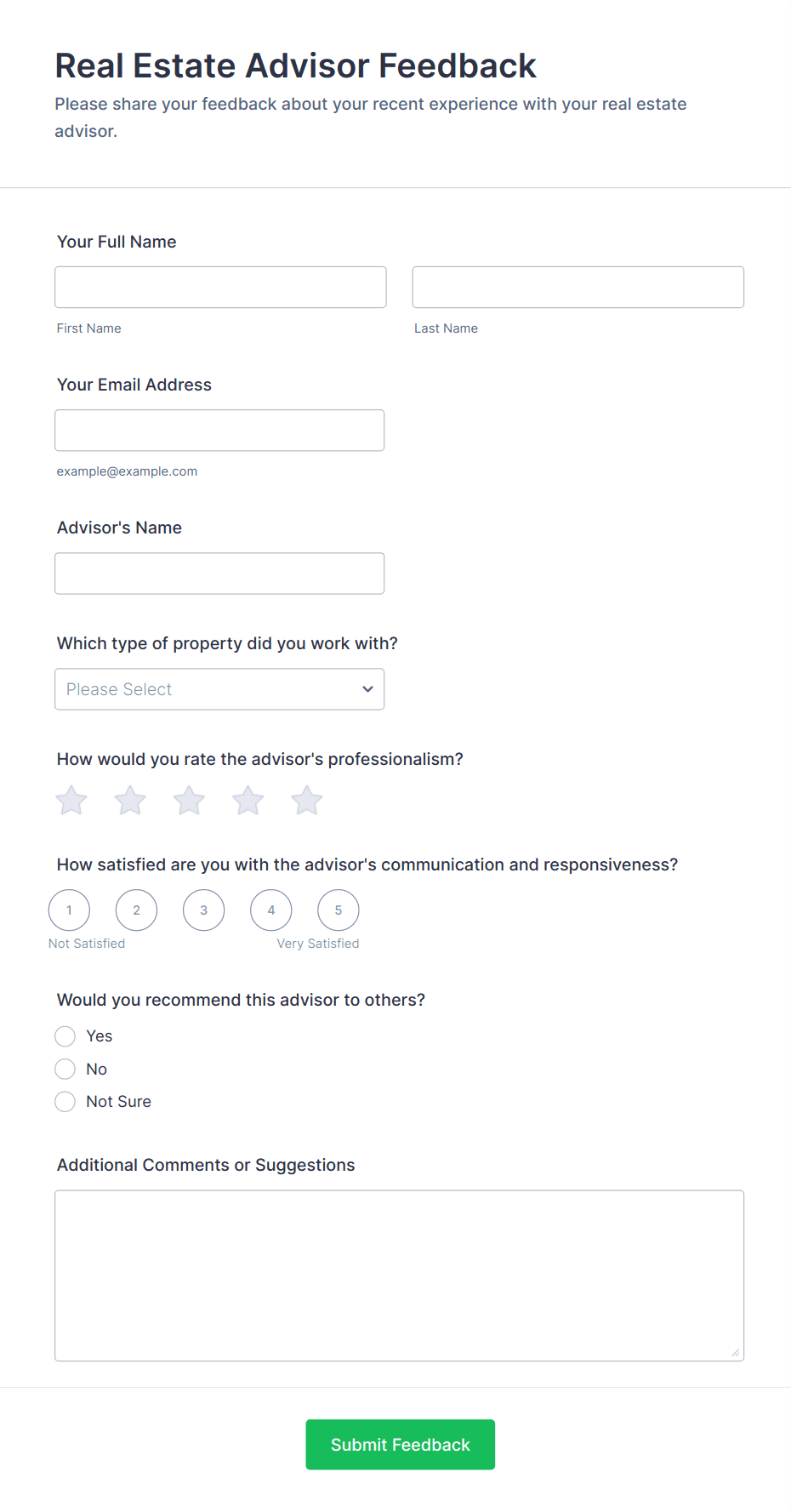 Real estate agents, brokers, property managers, landlords, leasing offices, and real estate agencies can all benefit from using feedback forms.