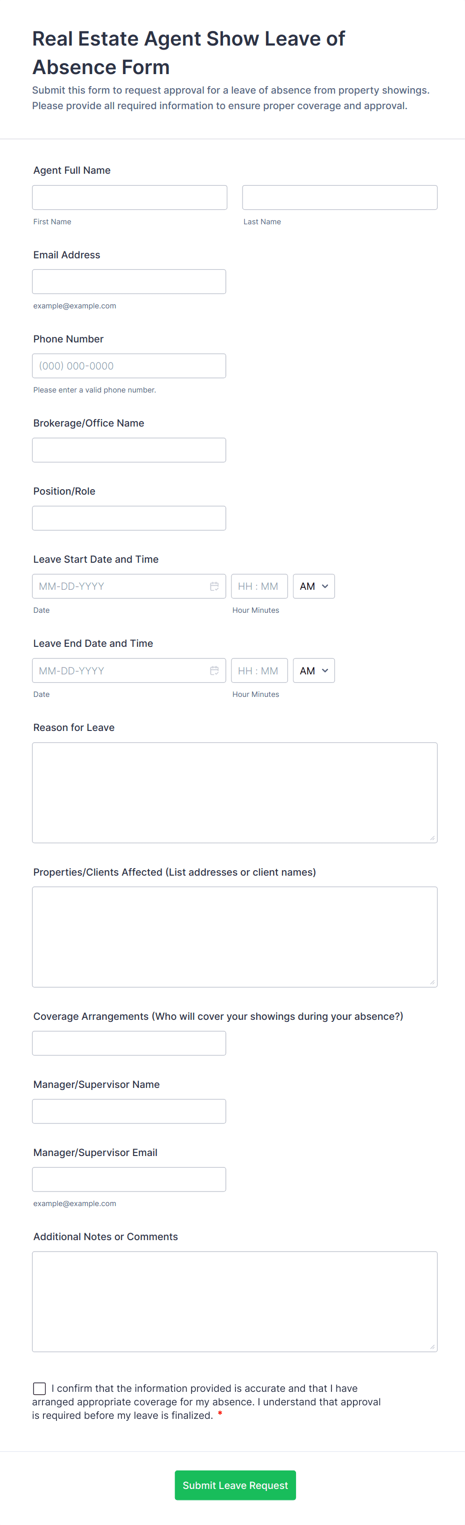 Common fields include employee name, department, type of leave, dates of absence, reason for leave, and any required supporting documentation.