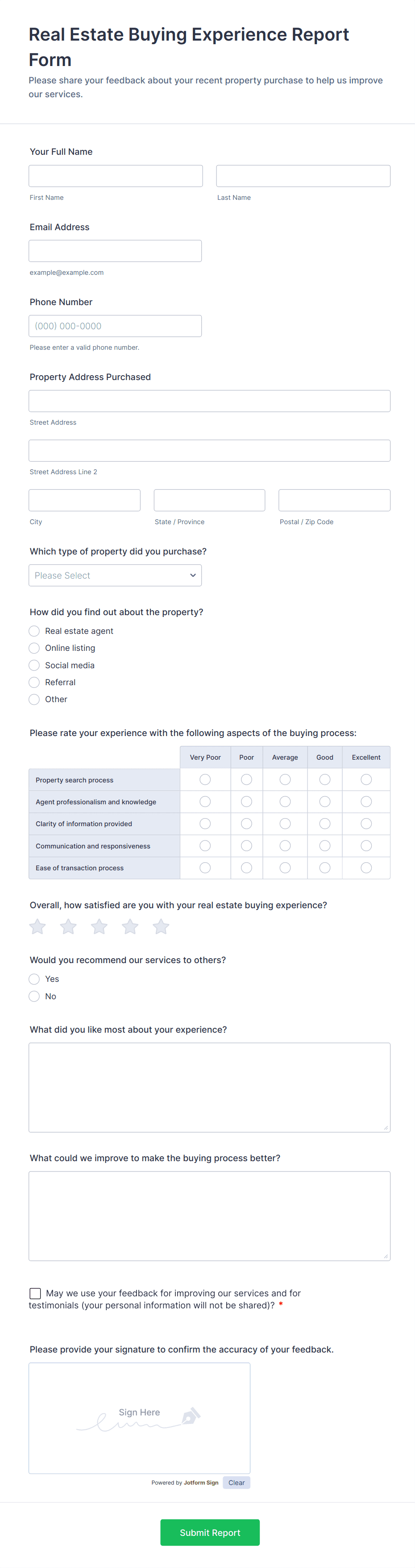 A real estate feedback form is a digital questionnaire used to collect opinions and suggestions from clients, tenants, or property visitors about their experiences with properties, agents, or management services.