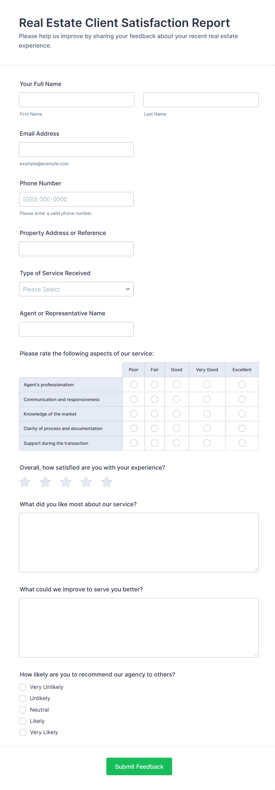 Real estate agents, brokers, property managers, landlords, leasing offices, and real estate agencies can all benefit from using feedback forms.