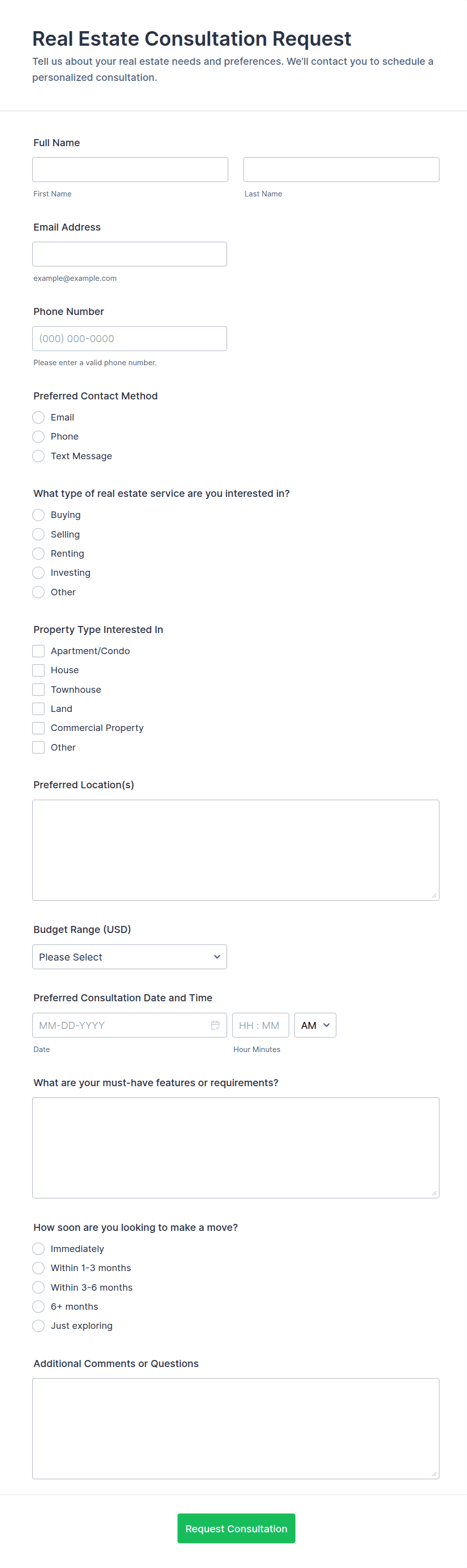 If you have a real estate listing on a website, you can use this Buyer Information Form to gather information regarding their property preferences in full detail, budget information and contact details.