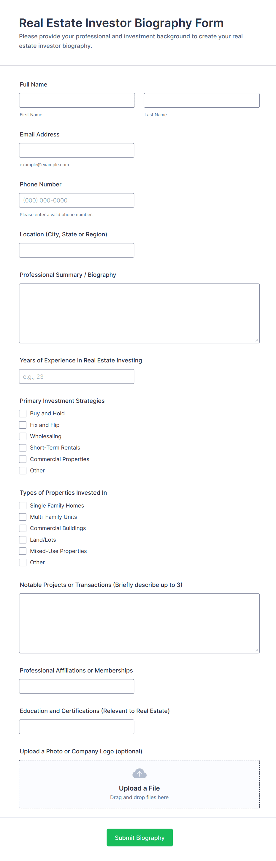 A Real Estate Investor Onboarding Form helps agencies collect key business details from investors efficiently, streamlining setup for targeted lead-generation campaigns.