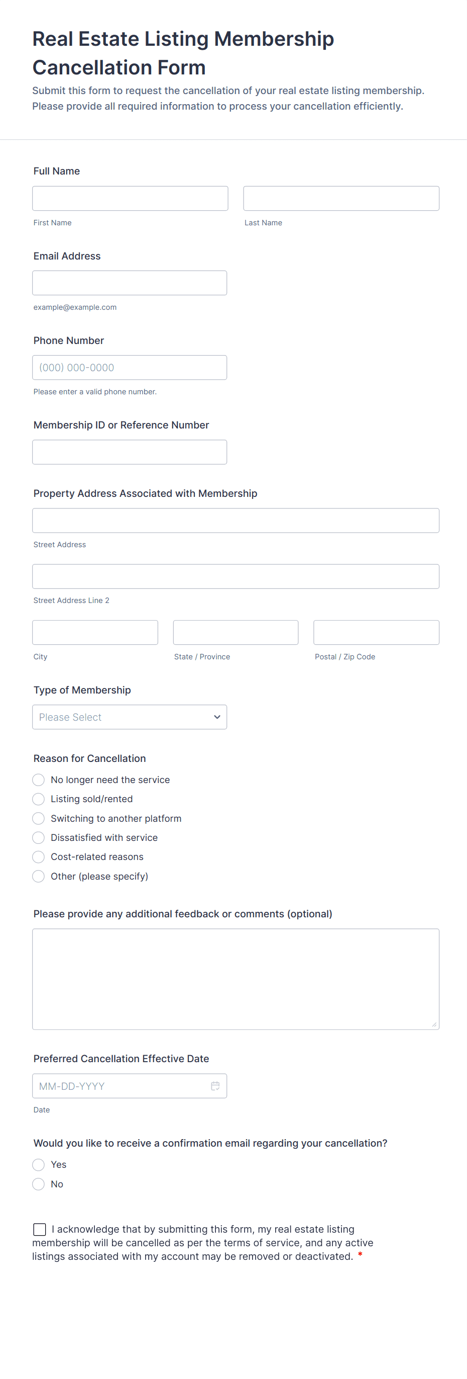 Common fields include the user’s name, contact information, account or membership number, reason for cancellation, date of last service, and any feedback or comments.