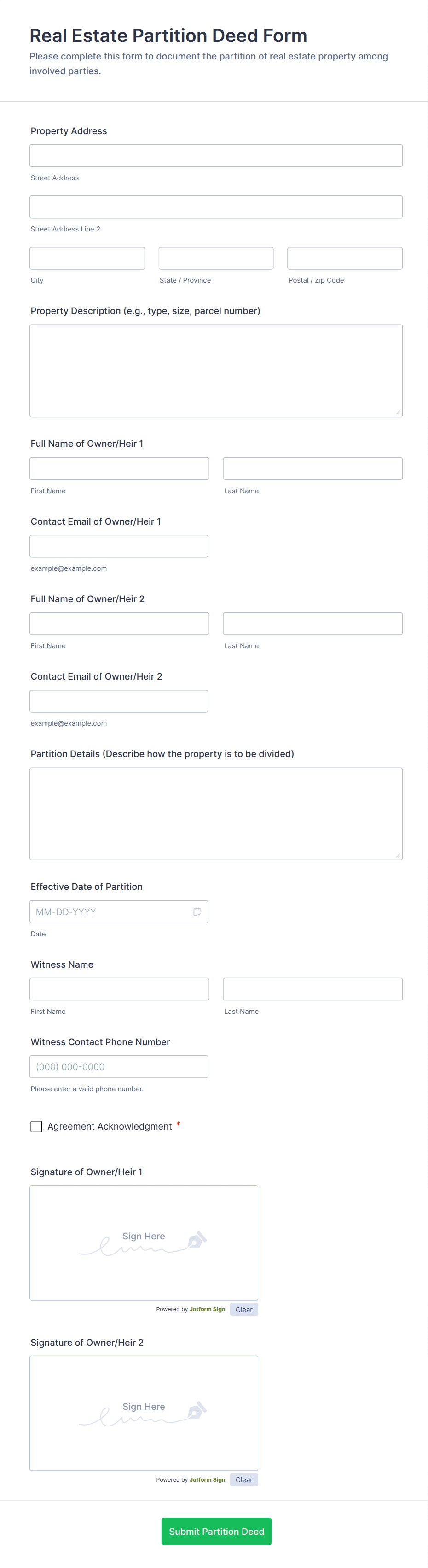 The form templates here are for informational purposes only. Jotform is not providing legal, financial, or other advice, or implying that the forms are legally valid in all or any jurisdictions. Before using any such form, consult an attorney and/or other applicable professionals to make sure that the form meets your needs, legally and otherwise.