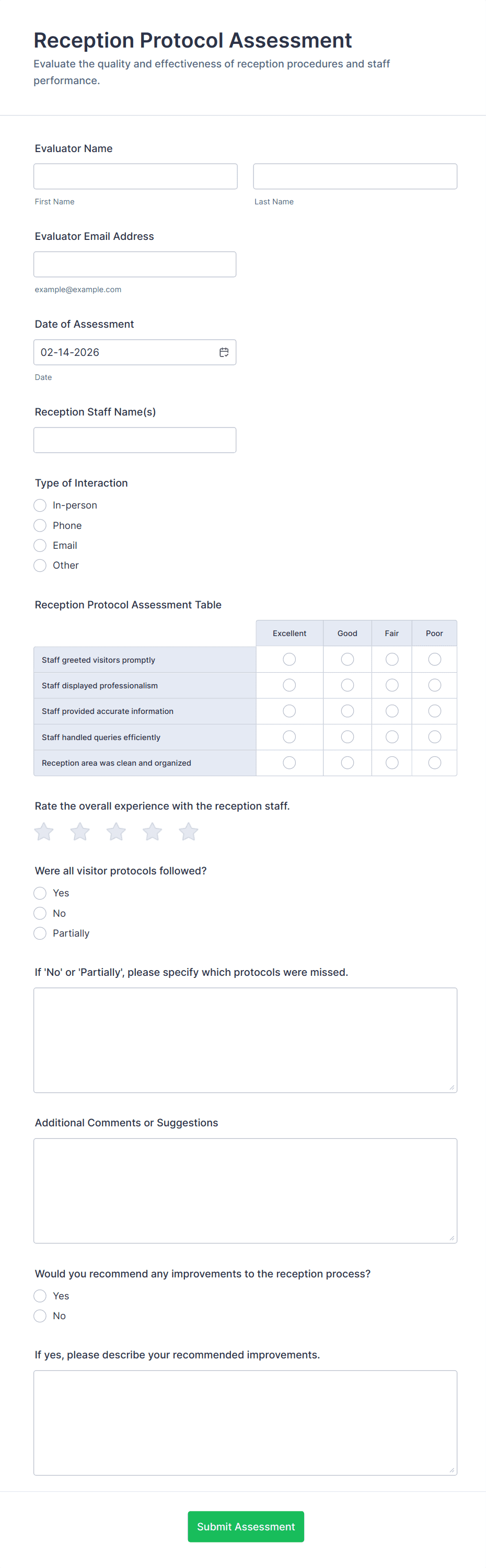 Assessment Form Templates are pre-designed digital forms used to evaluate, measure, or analyze knowledge, skills, performance, or other criteria across a variety of settings. These templates are commonly utilized in education for student assessments, in the workplace for employee evaluations, in healthcare for patient screenings, and in many other fields where structured feedback or data collection is essential. Assessment forms can range from simple quizzes and self-assessments to complex multi-section evaluations, making them versatile tools for gathering actionable insights and supporting decision-making processes.