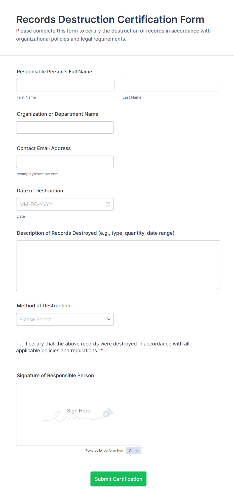The form templates here are for informational purposes only. Jotform is not providing legal, financial, or other advice, or implying that the forms are legally valid in all or any jurisdictions. Before using any such form, consult an attorney and/or other applicable professionals to make sure that the form meets your needs, legally and otherwise.