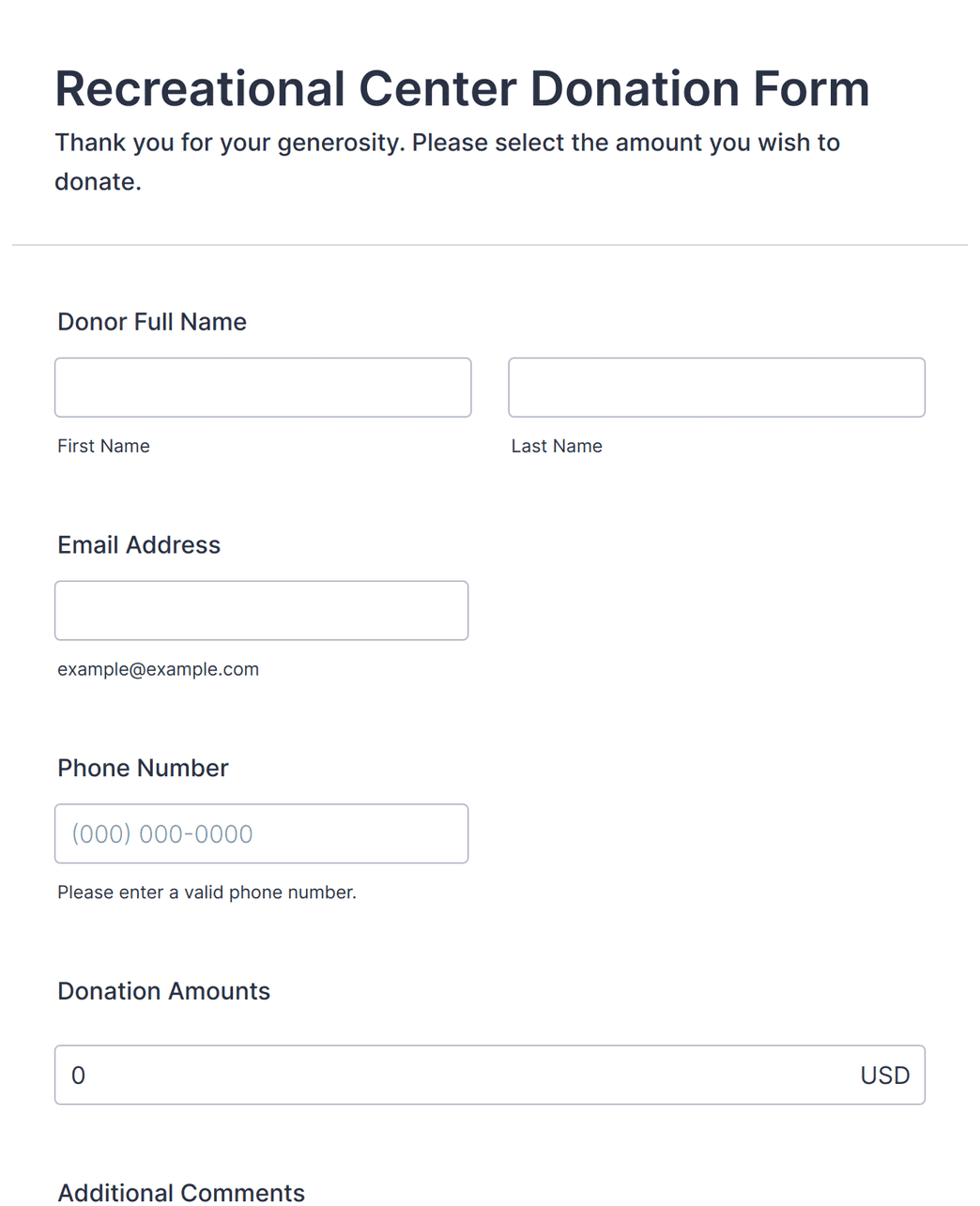 • Donation amount (with options for preset amounts or custom entry)