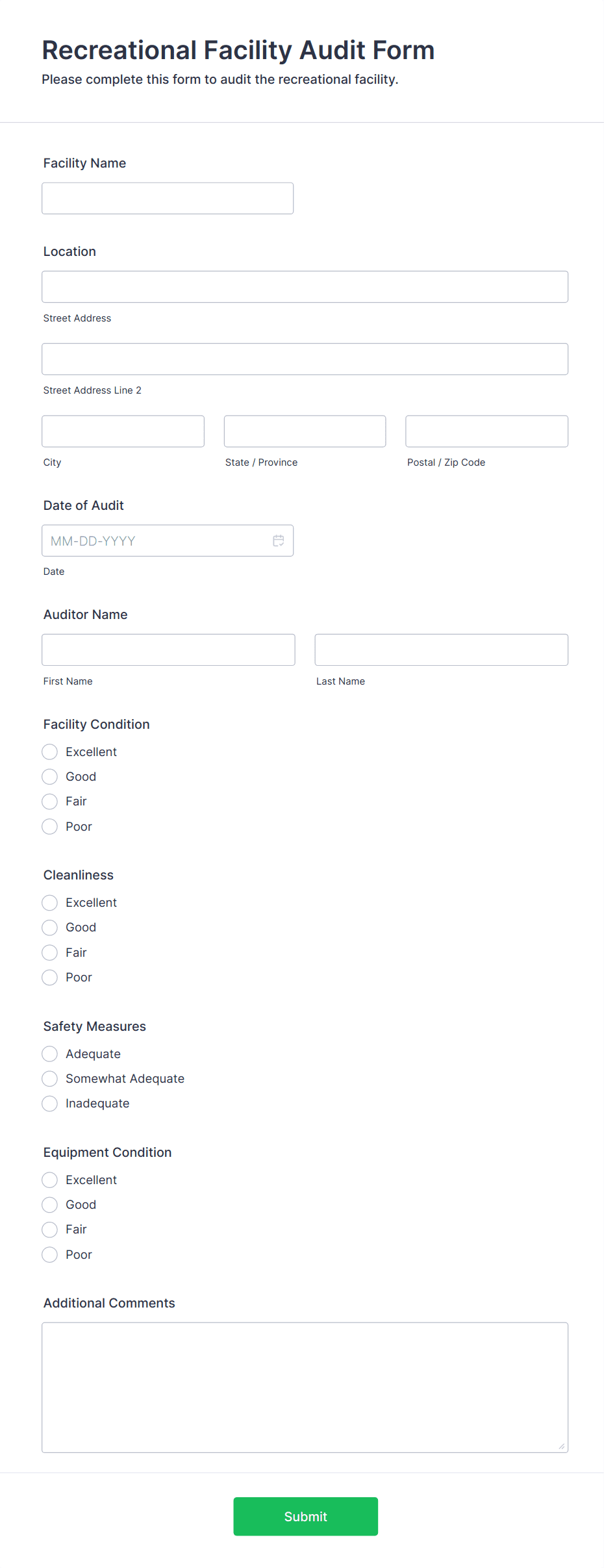 - Customize fields based on your audit type (e.g., safety, quality, compliance).