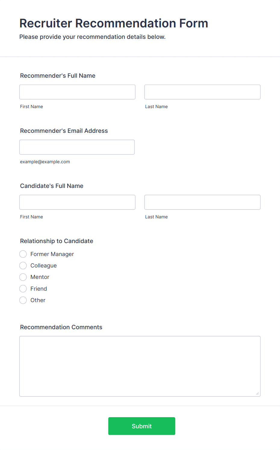 Looking for a way to improve your hiring process? Collect job applications, resumes, and surveys seamlessly from any device with online Recruiter Forms. Select a form template to customize with Jotforms no-code builder — just drag and drop to get the look you want, integrate with 100+ third-party platforms, and personalize form fields. You can then share your form by embedding it in your company website or sharing it directly with applicants via email or social media. All submissions are stored in Jotform Tables, easy to keep organized and view as a spreadsheet, calendar, or individual cards. Make your HR department more efficient with free Recruiter Forms from Jotform.