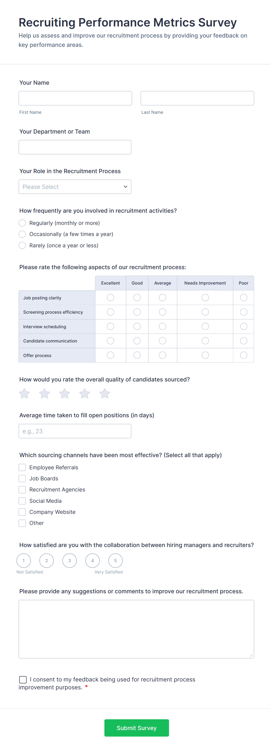 A Human Resources Survey is a structured questionnaire used by HR departments to collect feedback, opinions, and data from employees or job candidates on various workplace topics such as satisfaction, training, onboarding, and company culture.