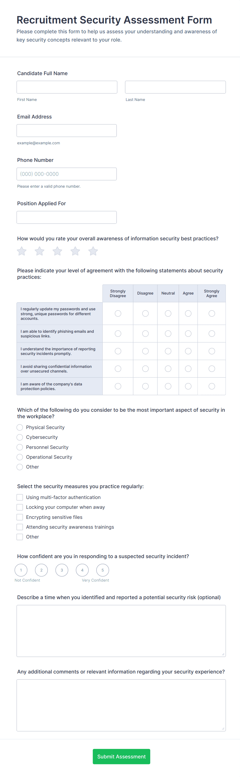 Interview Assessment Form is a form template that allows you to conduct structured and efficient job interviews, capturing essential candidate information and interviewer feedback using Jotform's intuitive design.