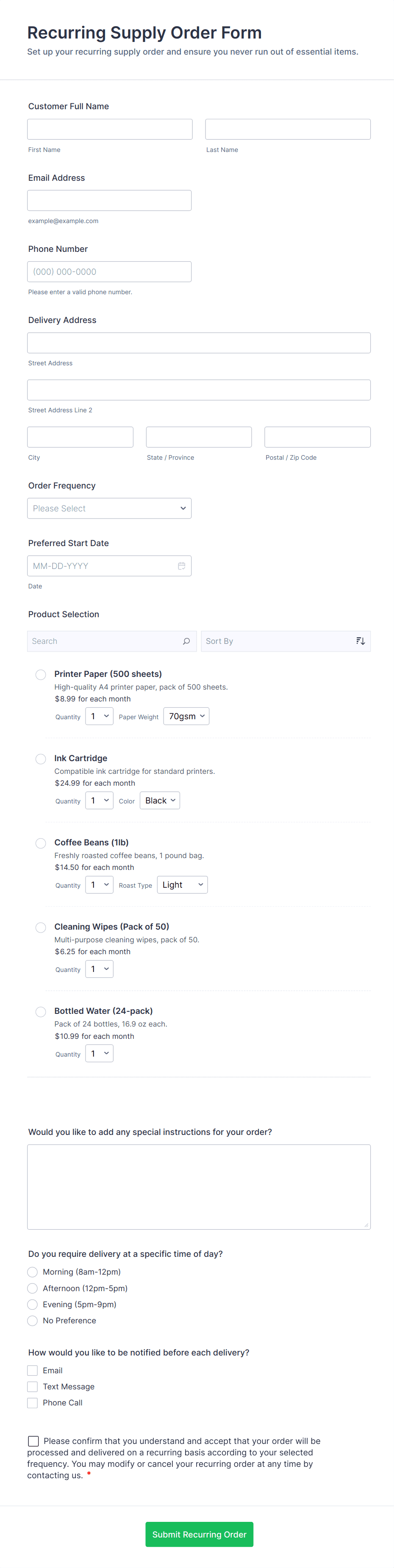 Creating a supply order form with Jotform is a straightforward process that can be tailored to your organization’s specific needs. Whether you’re managing office supplies, medical equipment, or event materials, Jotform’s flexible platform allows you to design forms that streamline procurement and improve record-keeping.