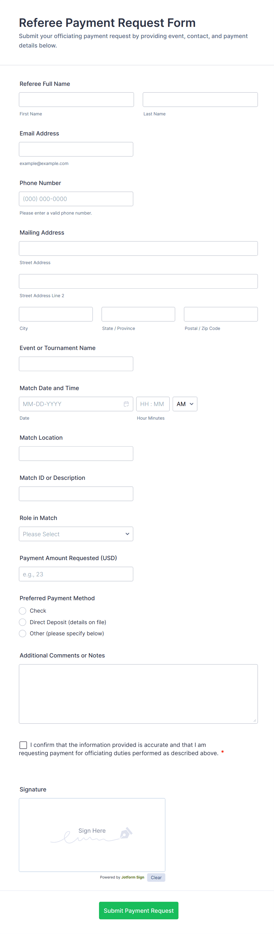Payment forms are specialized online forms designed to securely collect payments, donations, fees, or orders from customers, clients, or donors. These forms are commonly used by businesses, nonprofits, educational institutions, and service providers to facilitate transactions such as product sales, event registrations, membership fees, or charitable contributions. Payment forms streamline the payment process by allowing users to enter their payment details directly on the form, often integrating with popular payment gateways like PayPal, Stripe, or Square. This eliminates the need for manual invoicing or offline payment collection, making transactions faster and more convenient for both parties.