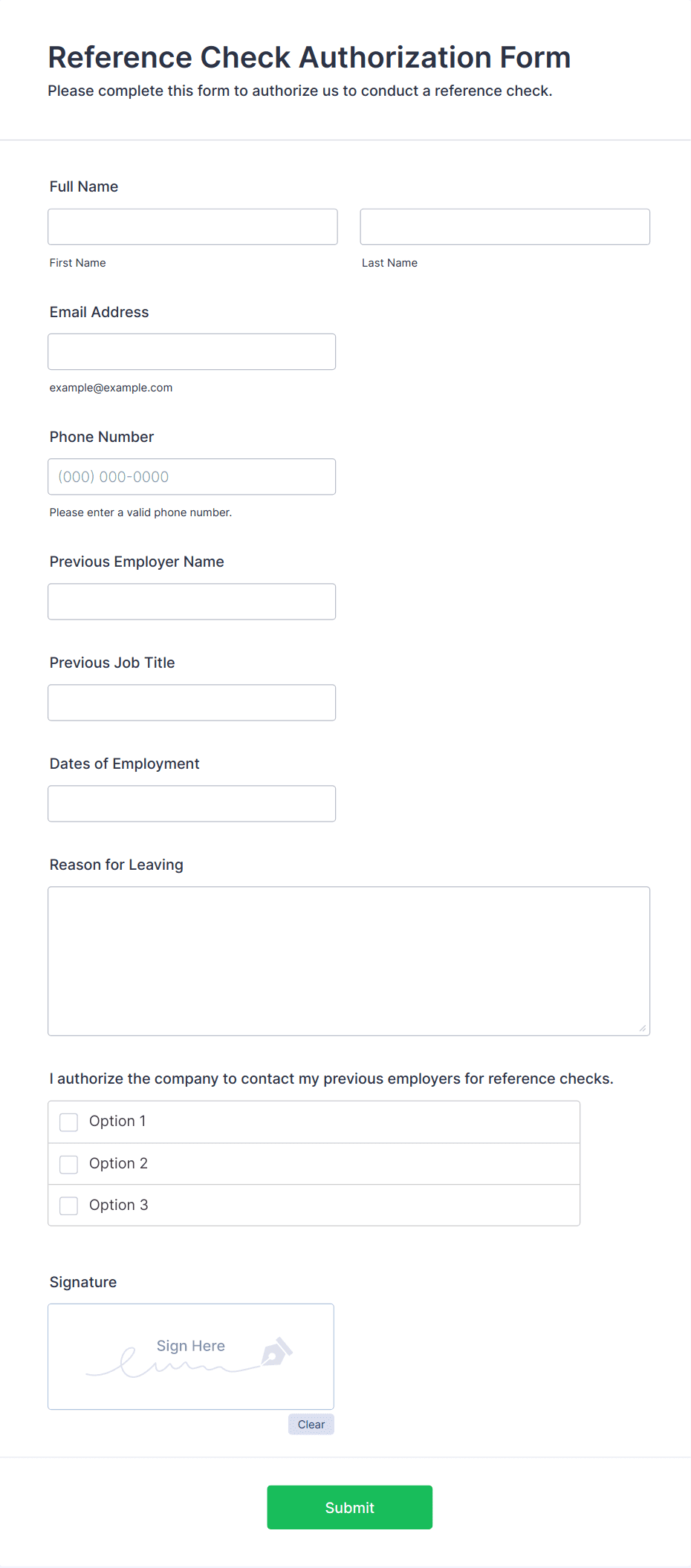 • For job applications, include fields for personal information, education, work experience, references, and file uploads for resumes or cover letters.