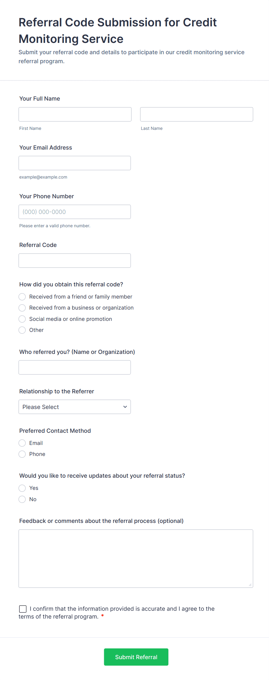 • For healthcare or sensitive referrals, include fields for privacy agreements or HIPAA compliance.