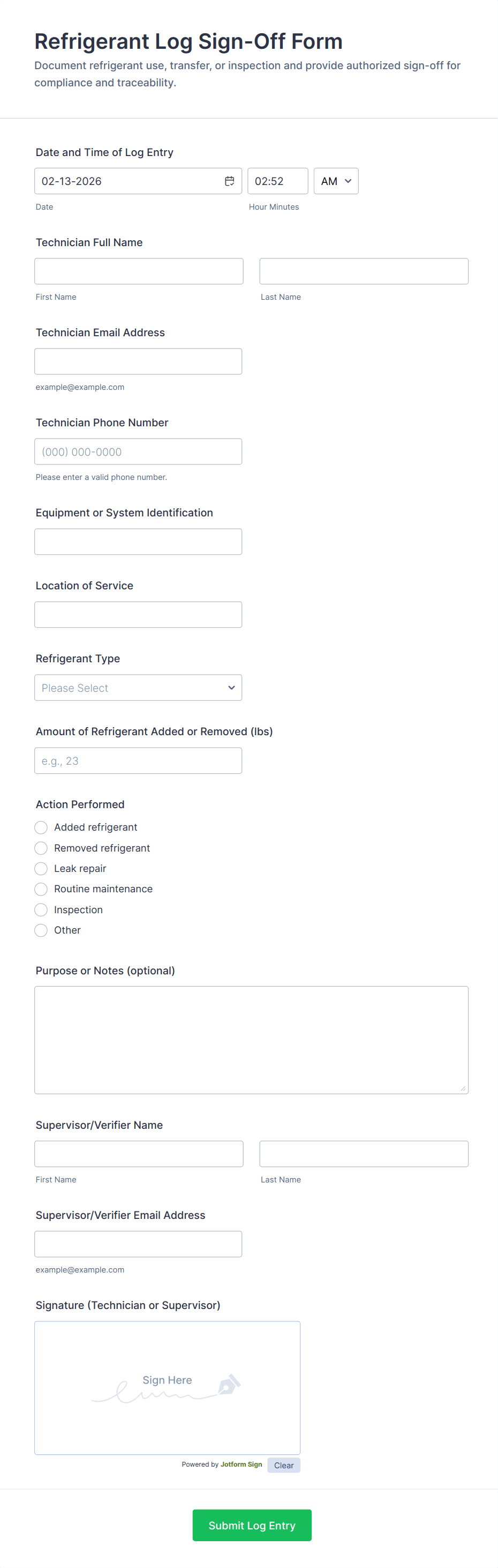 Hydraulic System Maintenance Log Form Template for documenting inspections and repairs on hydraulic equipment, helping technicians and facility teams standardize data collection and keep maintenance records organized in Jotform.