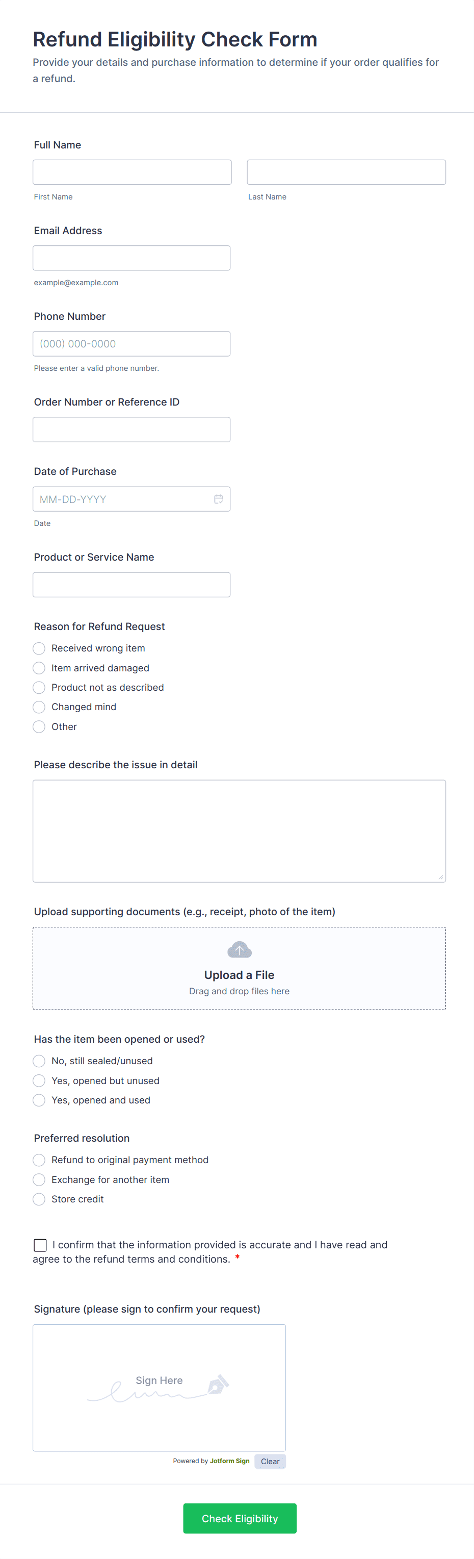 - E-commerce Refunds: May require order number, product details, reason for return, and upload fields for receipts or photos.