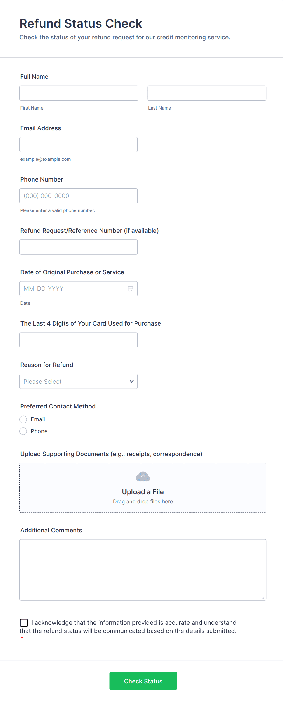 - E-commerce Refunds: May require order number, product details, reason for return, and upload fields for receipts or photos.