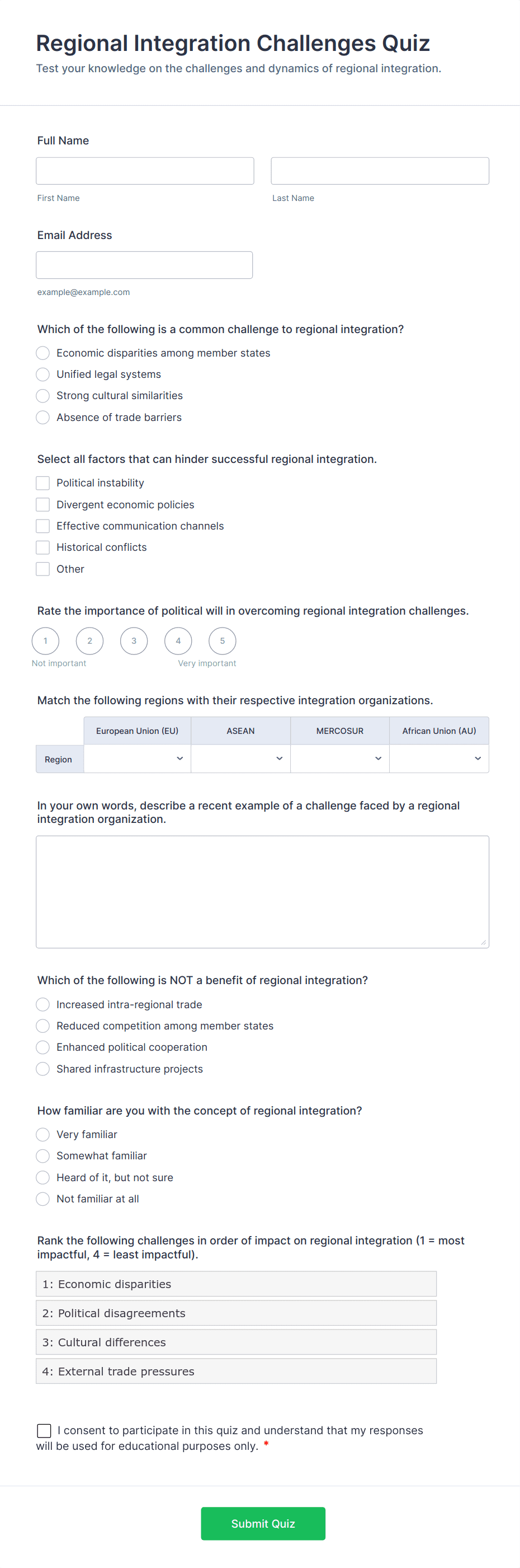Quiz students on geography with this free online quiz template you can customize for your classroom. Easy to embed on your class website. No coding required.