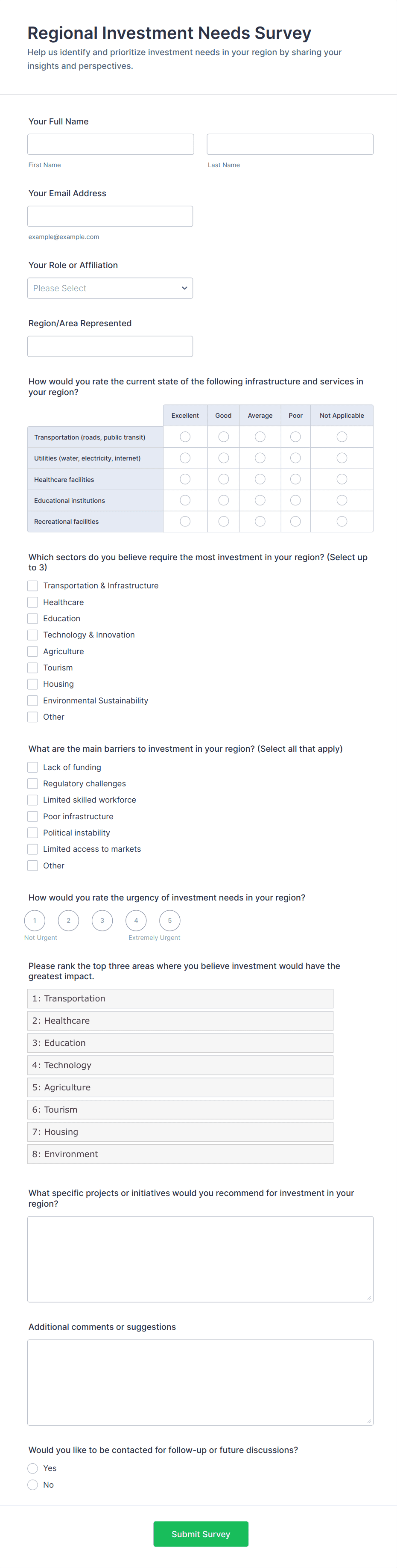 For employee surveys, consider adding anonymity options; for customer surveys, include contact fields if follow-up is needed.