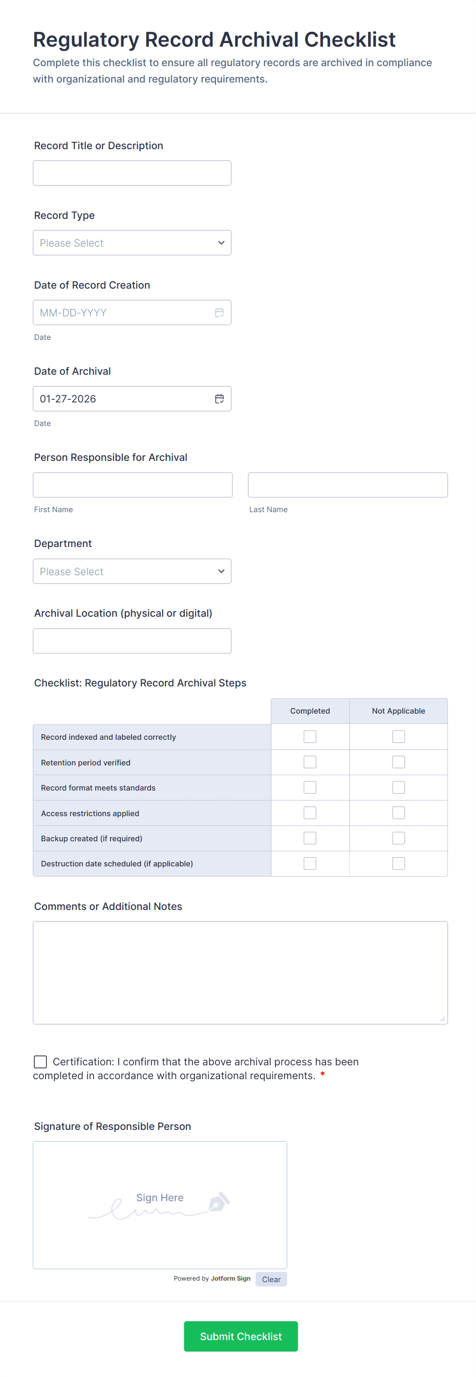 By following these steps, you can create a checklist form that streamlines your processes, ensures consistency, and provides valuable documentation for compliance or reporting. Jotform’s flexibility allows you to adapt your checklist forms as your needs evolve, making it a powerful tool for ongoing task management.