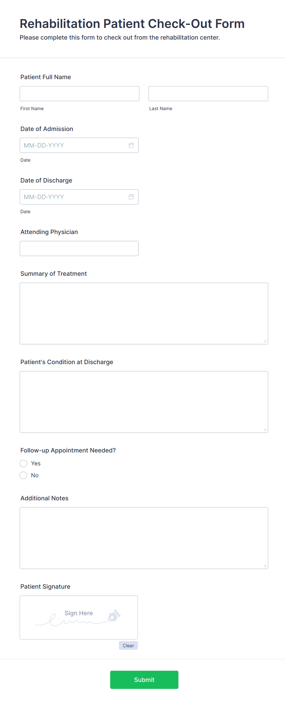 Collect valuable insights from patients after discharge with the Patient Discharge Feedback Form. Customize easily using Jotform's no-code form builder and streamline your data collection.