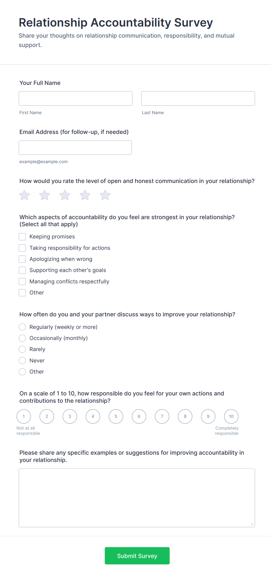 • Multiple Choice or Rating Scale questions (e.g., “How satisfied are you with communication in your relationship?”)
