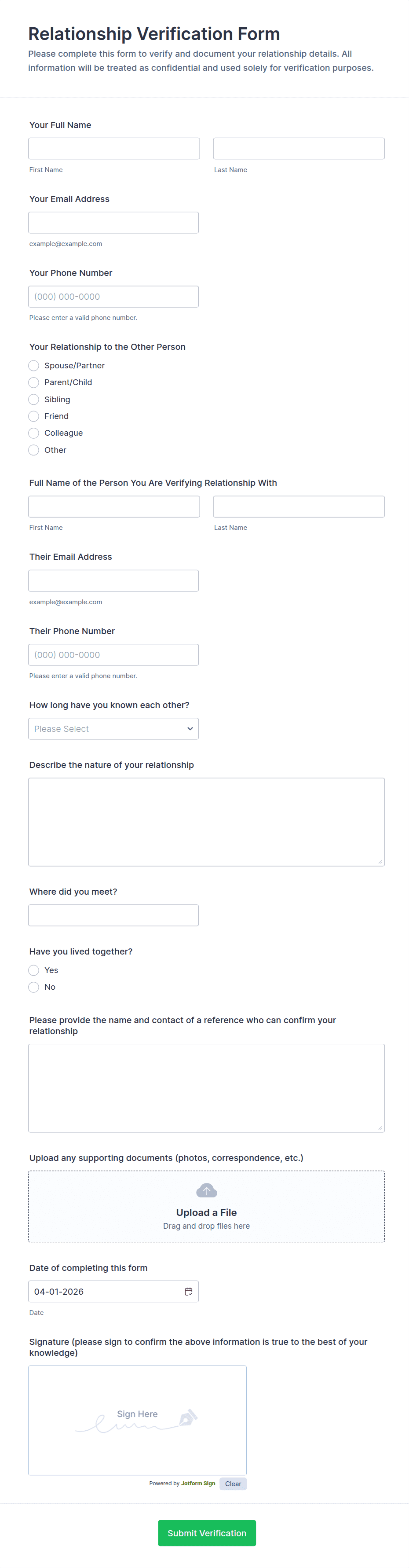 Verification forms are specialized digital tools designed to authenticate, validate, or confirm information provided by individuals or organizations. These forms are commonly used to verify identities, credentials, employment status, addresses, or other critical data points in a secure and efficient manner. Typical use cases include onboarding new employees, confirming student enrollment, validating customer identities for financial services, or ensuring the accuracy of submitted documents in compliance processes. By streamlining the verification process, these forms help organizations reduce fraud, maintain regulatory compliance, and build trust with their stakeholders.
