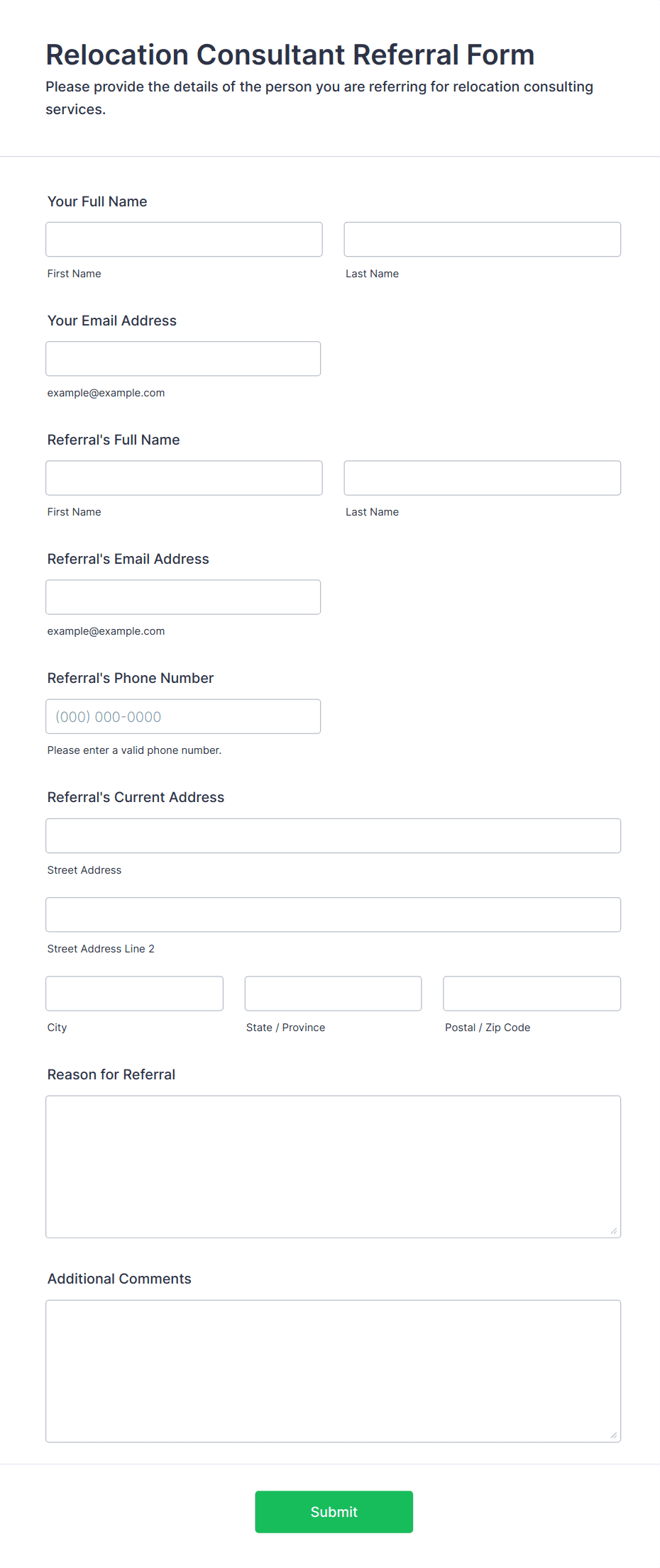 • Service Provider Referrals: Legal, financial, or consulting firms use referral forms to recommend trusted partners or specialists to clients. These forms might request case details, urgency, and specific expertise needed.
