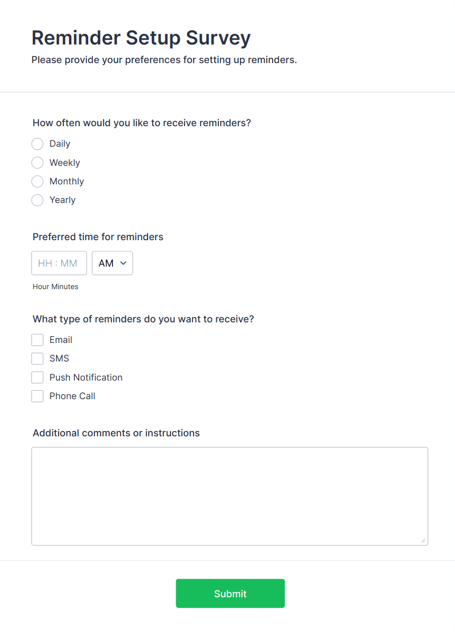 Survey templates are pre-designed forms that help individuals and organizations collect feedback, opinions, or data from a target audience. These templates are widely used for a variety of purposes, such as customer satisfaction surveys, employee engagement assessments, market research, event feedback, and academic studies. By providing a structured set of questions, survey templates streamline the process of gathering valuable insights, making it easier to analyze trends, measure satisfaction, and make informed decisions. Whether you’re a business owner, HR professional, educator, or researcher, survey templates offer a quick and effective way to reach your audience and collect actionable information.