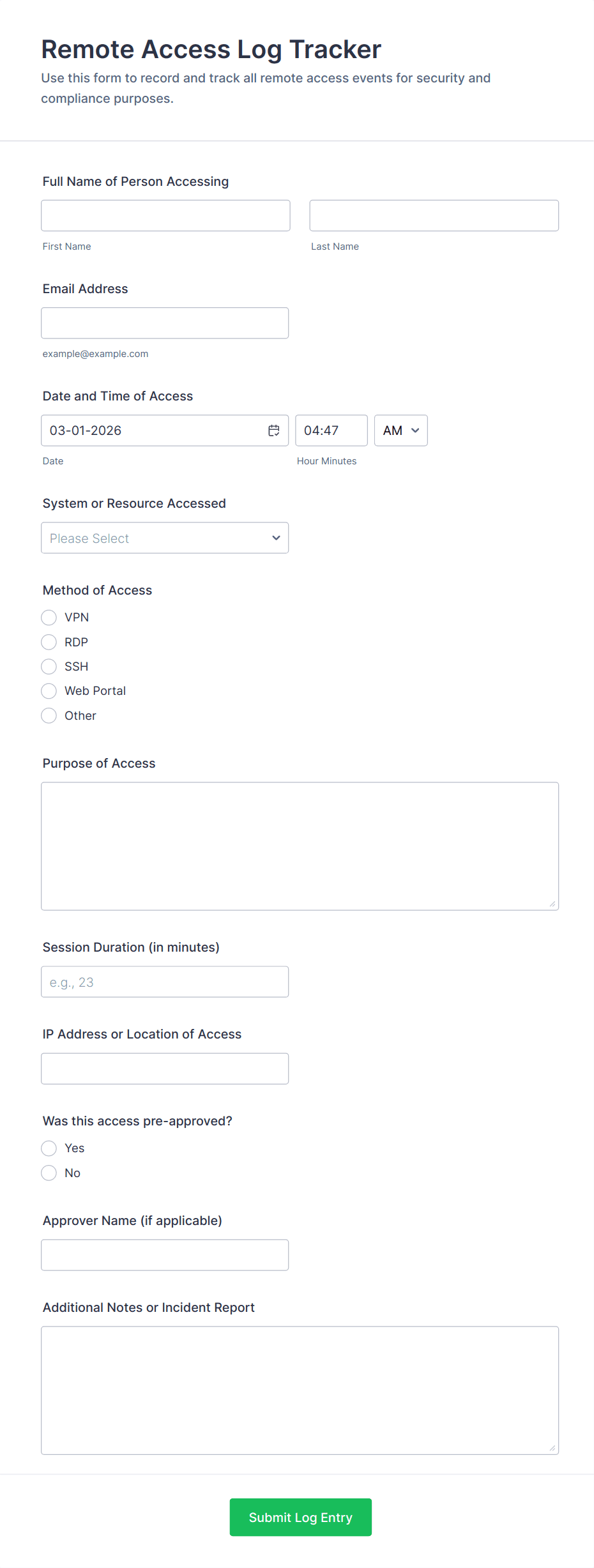 Remote Work Access Request Form is a customizable template for IT departments to collect employee details, approve remote access, and streamline secure remote work authorization.