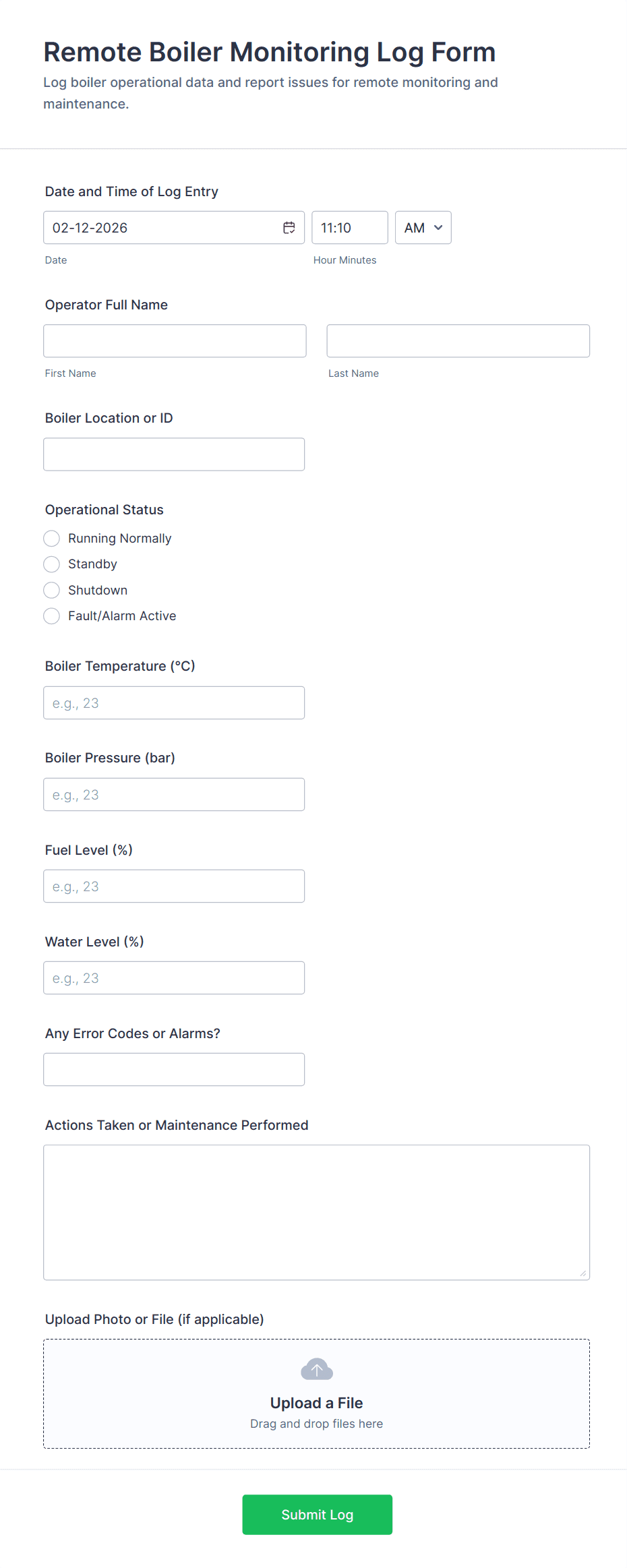 - Equipment Monitoring Forms: Require asset identification fields, maintenance schedules, and status dropdowns.