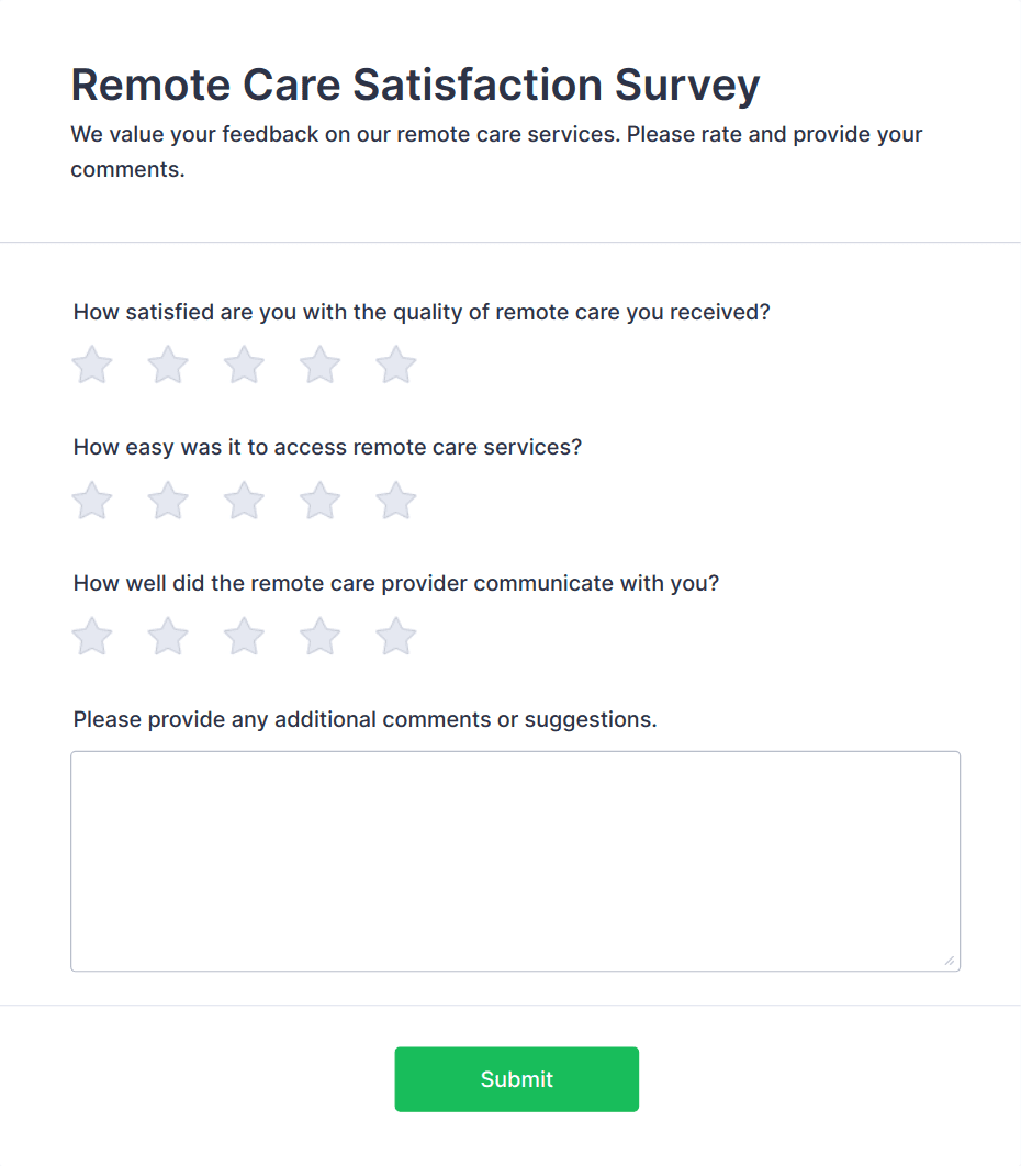 A patient feedback form is a survey with questions that allows medical doctors to gather feedback from patients regarding their overall experience with the clinic.