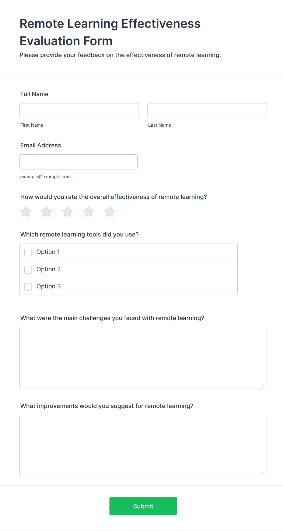 • For teacher or staff surveys: Include self-assessment fields, peer review sections, and narrative response options.