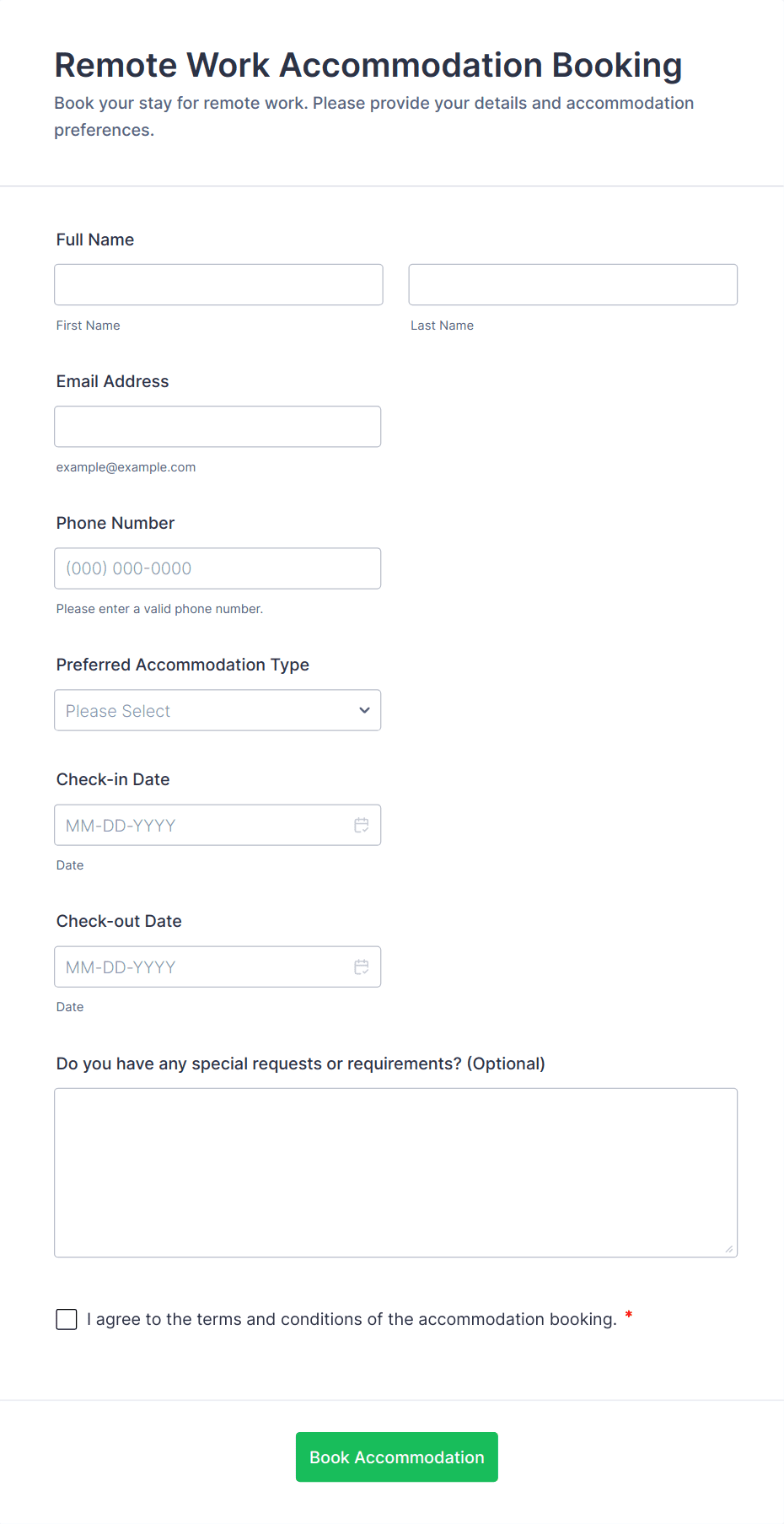 • Add conditional logic to show or hide fields based on user responses (e.g., only display equipment fields if “Equipment Needed” is selected).