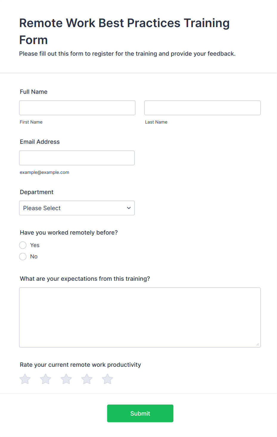 A Training Registration Form is a user-friendly form template designed to streamline the registration process for training providers, corporate HR teams, nonprofits, and event management teams.