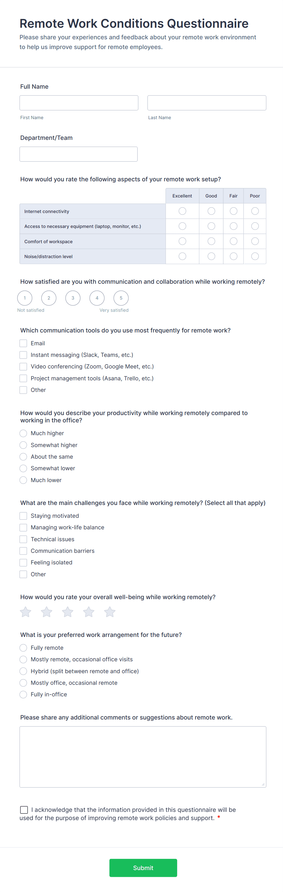 - Policy Acknowledgment: Checkbox or e-signature for agreement to remote work policies.
