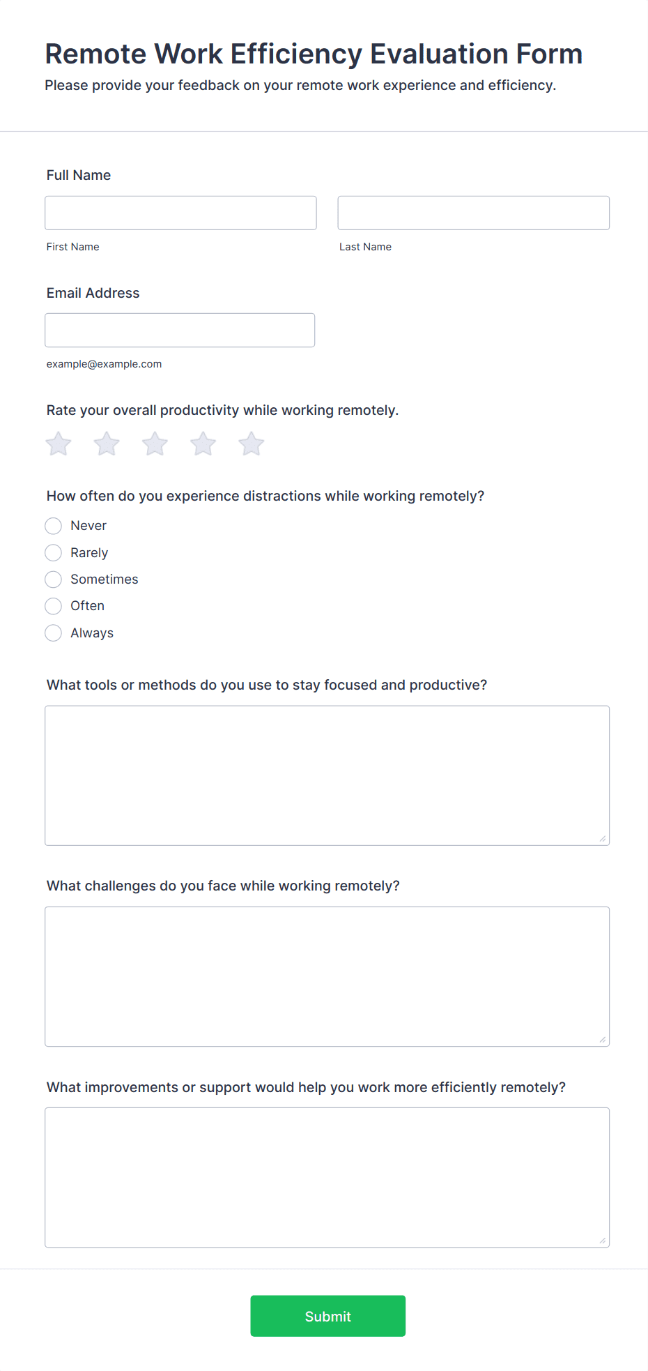 Create an anonymous feedback form in seconds with this ready-made template. Easy to customize and share. Works on any device. No coding knowledge required.