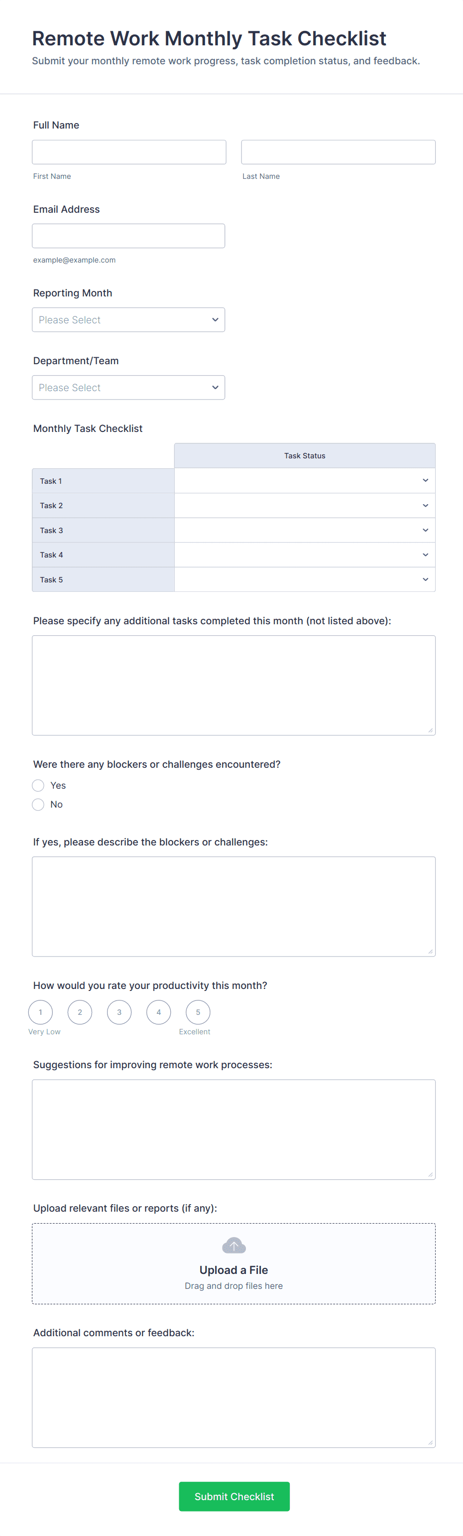 - Daily/Weekly Check-In Forms: Remote workers report on completed tasks, challenges, and goals for the next period.