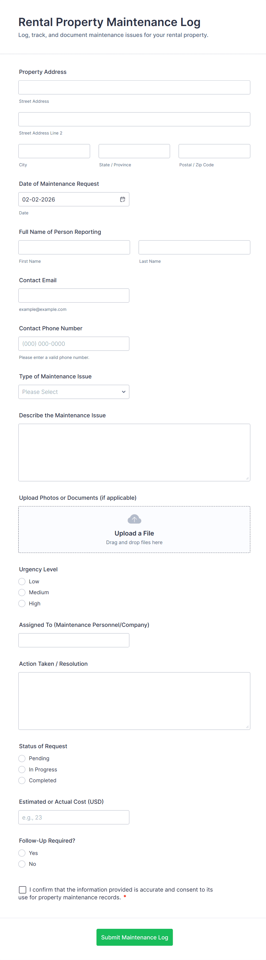 • Maintenance Requests: Tenant name, unit number, issue description, urgency level, file upload for photos.