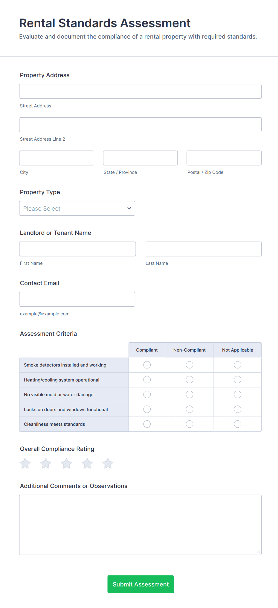 The Rental Property Inspection Form helps property managers and landlords assess rental units' conditions, ensuring accurate documentation and streamlined inspections.