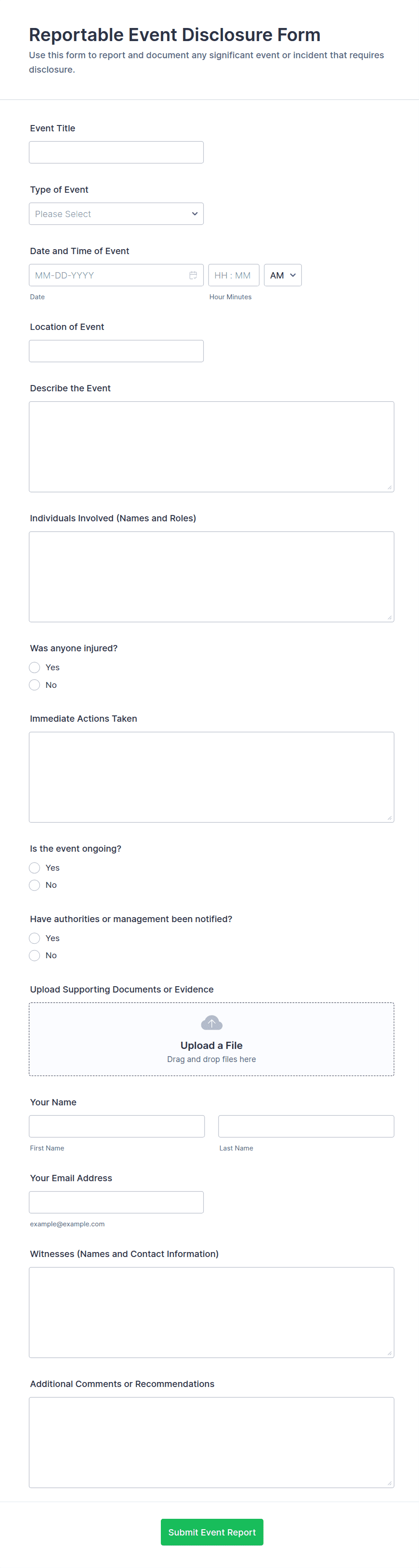 3. What information should be included in an incident report form?