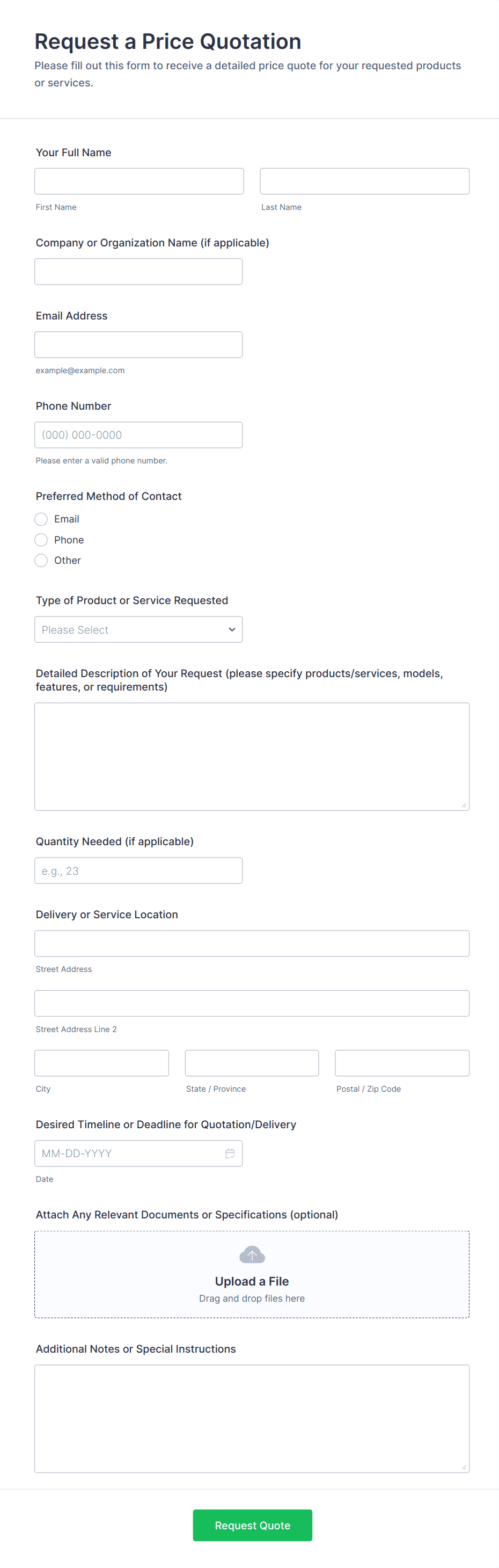 - For service-based quotes, include fields for location, preferred dates, and specific requirements.