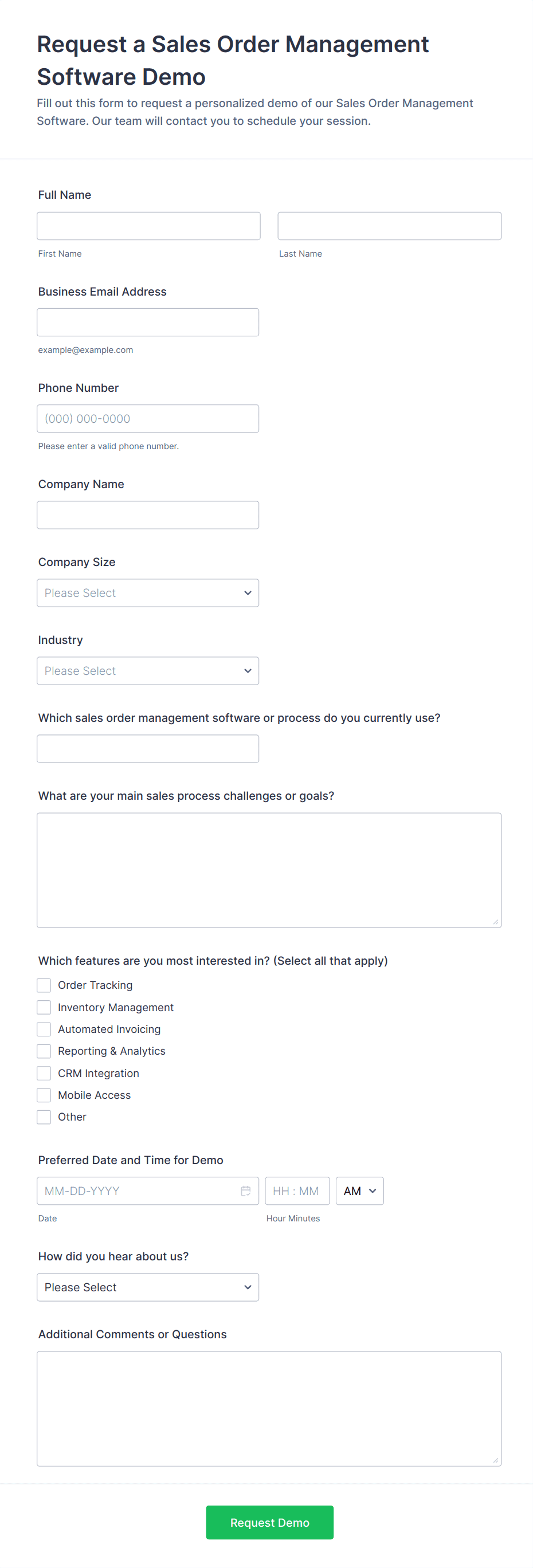 Sales order forms are essential business documents used to record and process customer orders for products or services. They serve as a formal agreement between a seller and a buyer, detailing the items requested, quantities, prices, payment terms, delivery information, and other relevant details. Sales order forms are widely used by retailers, wholesalers, manufacturers, and service providers to streamline the order-taking process, minimize errors, and ensure accurate fulfillment. Common use cases include online product sales, wholesale orders, custom product requests, and service bookings, making these forms a critical component of efficient sales operations.