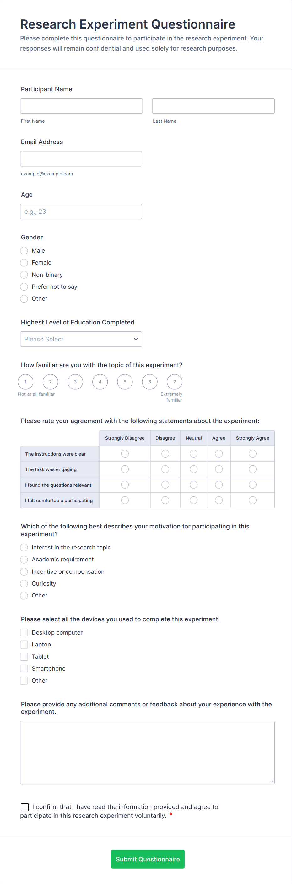 A questionnaire template is a pre-designed form used to collect structured information from respondents for various purposes, such as research, feedback, or assessments.